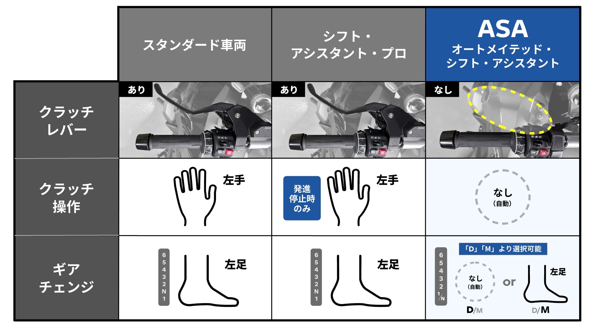 クラッチレバーの有無、クラッチ操作の必要性、そしてギアチェンジの方式など、ライダーが実際に行う操作を軸に整理したのが上図です。